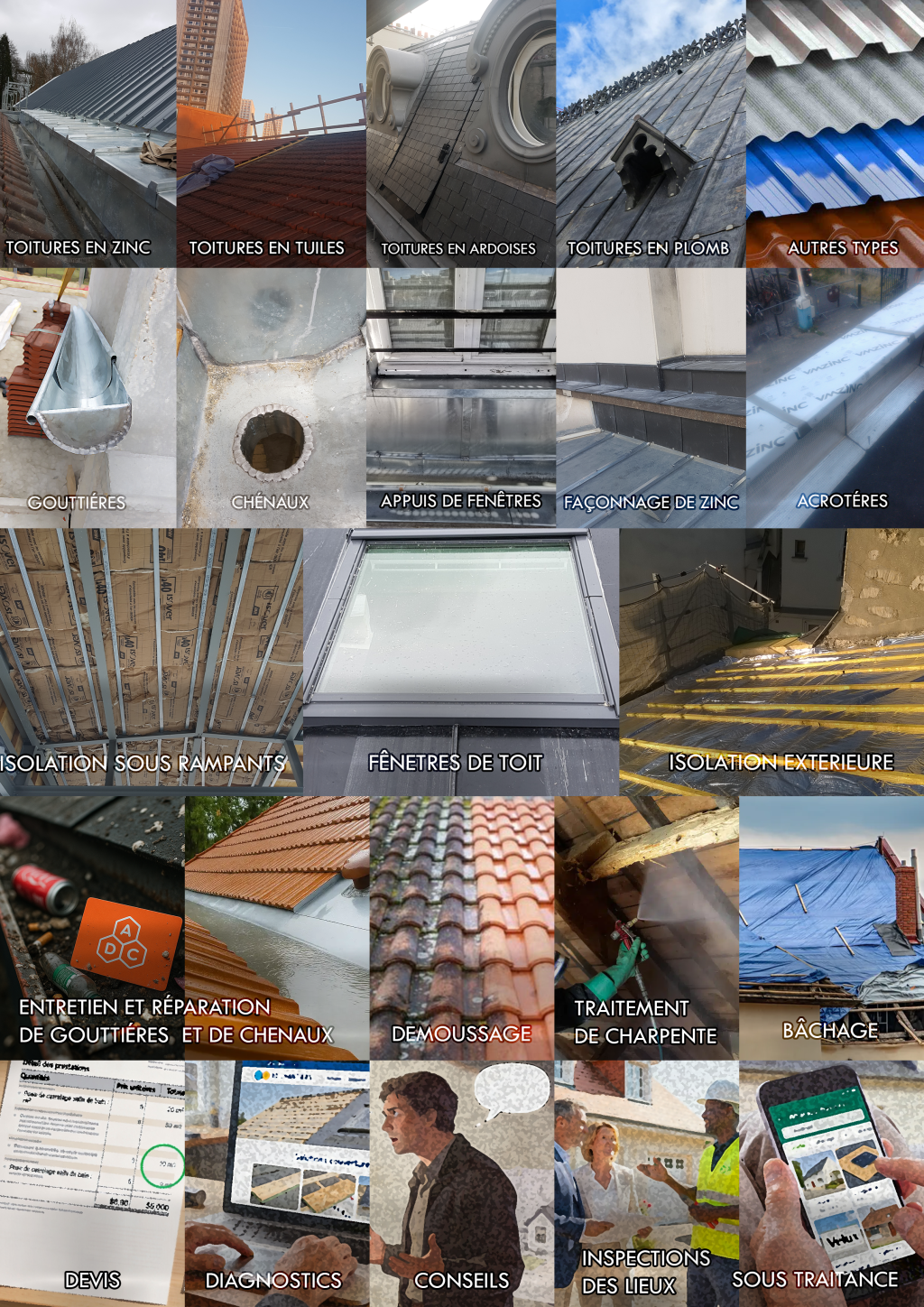 AD CHANTIERS, couvreur-zingueur Île-de-France, propose tous travaux toiture. Détails par service avec effectifs et moyens d’accès.